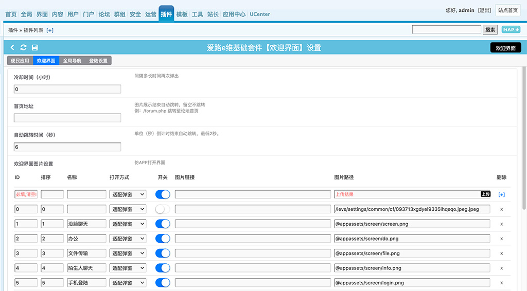 5. 后台可自定义欢迎界面的图片、描述、读秒时间、读秒完成跳转地址、显示间隔时长等