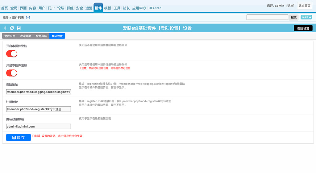 7. 后台 -> 登陆设置 可开关本插件的登陆、注册功能以及设置论坛的登陆、注册地址。