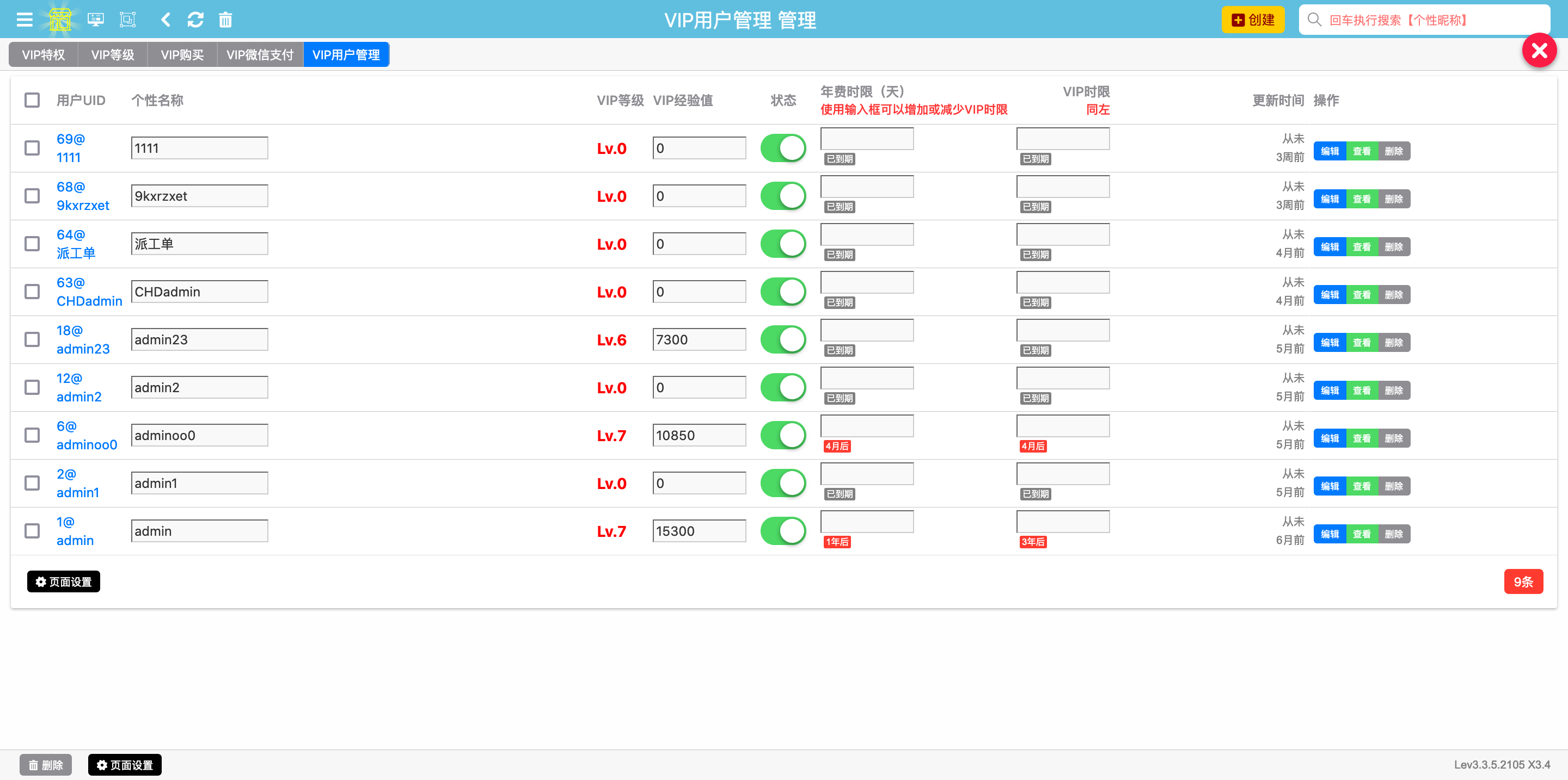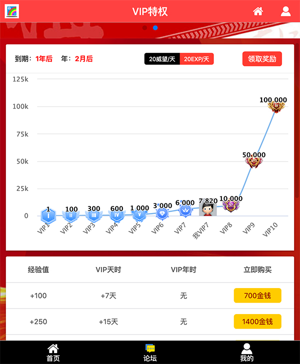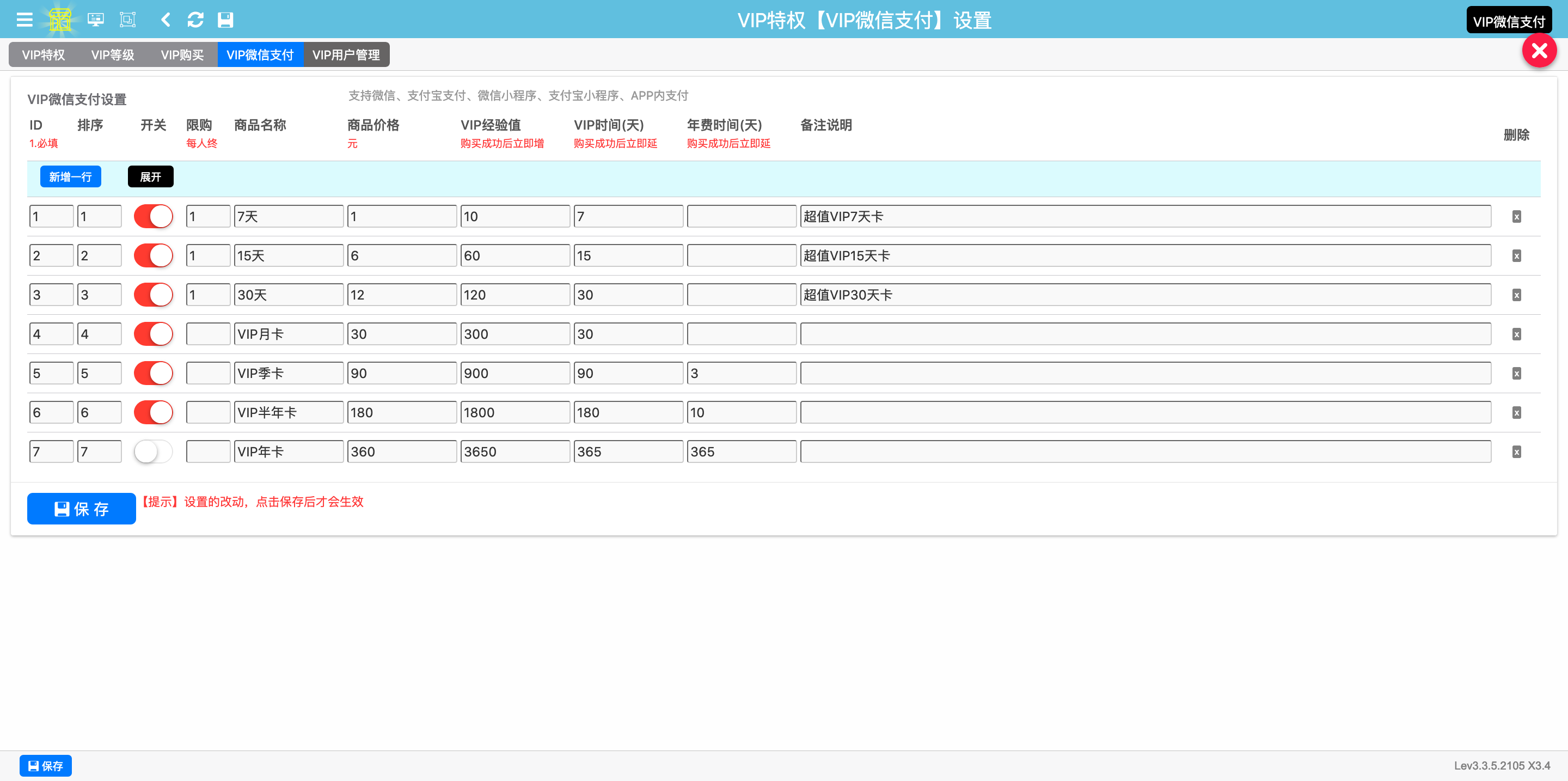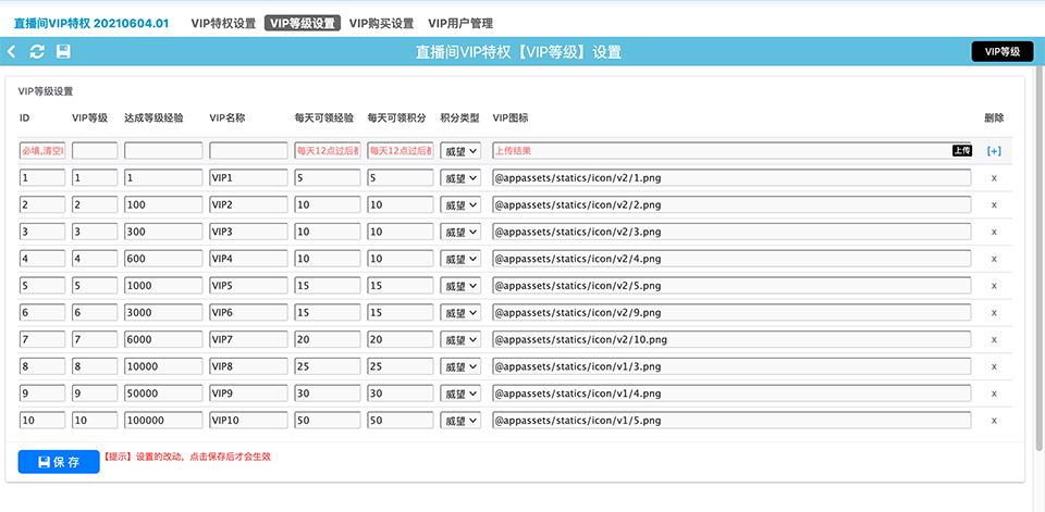 4.可设置每个VIP等级需要的经验值、图标、名称、每天可领取成长值和积分
